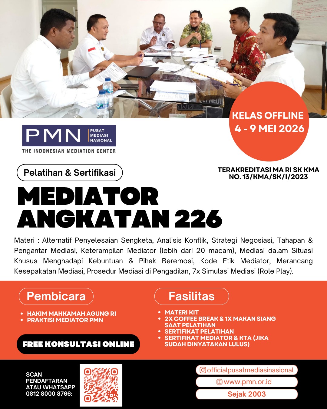 Kami mengadakan Pelatihan Sertifikasi Mediator untuk umum (reguler) dan in-house dengan fokus keterampilan untuk menjadi mediator profesional.